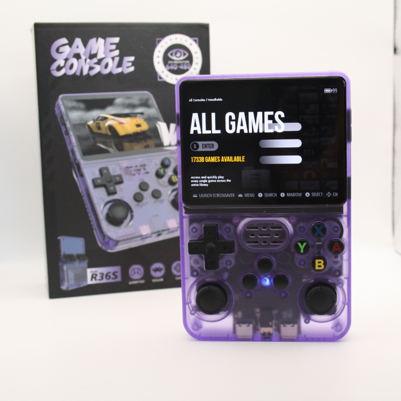 R36S-konsollen har et indbygget lithiumbatteri på 3200–3500 mAh, som typisk giver 4–6 timers spilletid ved normal brug, afhængigt af spil, lysstyrke og trådløse funktioner. Nogle oplever op til 7 timer, mens krævende spil kan forkorte tiden til 3 timer. Opladning tager ca. 4 timer, og batteriet kan kalibreres ved at lade det løbe helt tørt og oplade det fuldt et par gange for mere præcis visning af batteriprocent.
